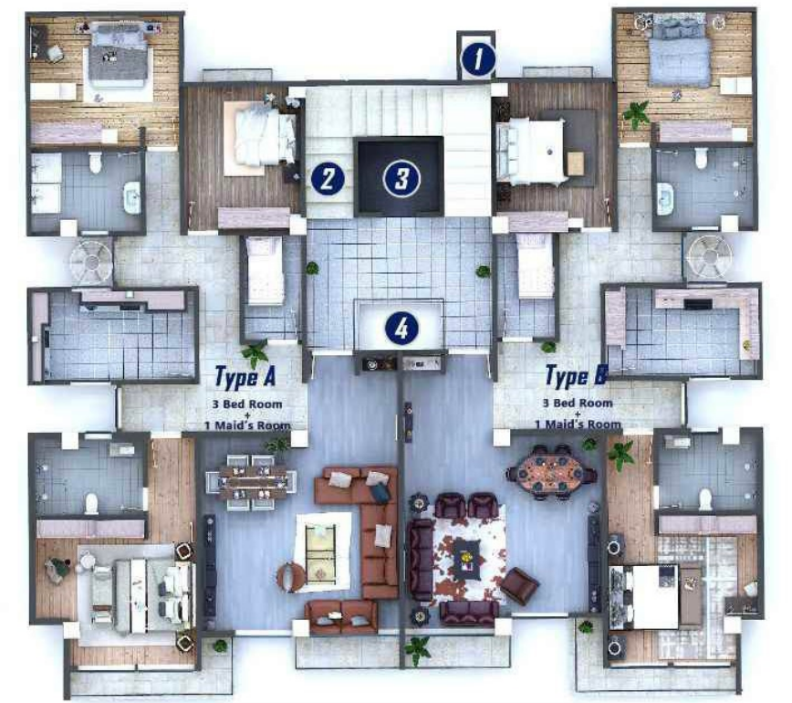 B.Premium Three-Bedroom Apartments {Type B}: Located on the 6th- 11th floor, these deluxe three-bedroom apartments offer a spacious layout, ensuring comfort for residents. This well-appointed apartment features three bedrooms, providing ample space for you and your family to relax and unwind. These apartments typically features a living and dinning room, kitchen, master bed room with it's own master bath room and a balcony, two children rooms, common bath room, balcony { for living,dining and kitchen}, maids room and corridor. The total gross area of the unit is 203.00sqm.