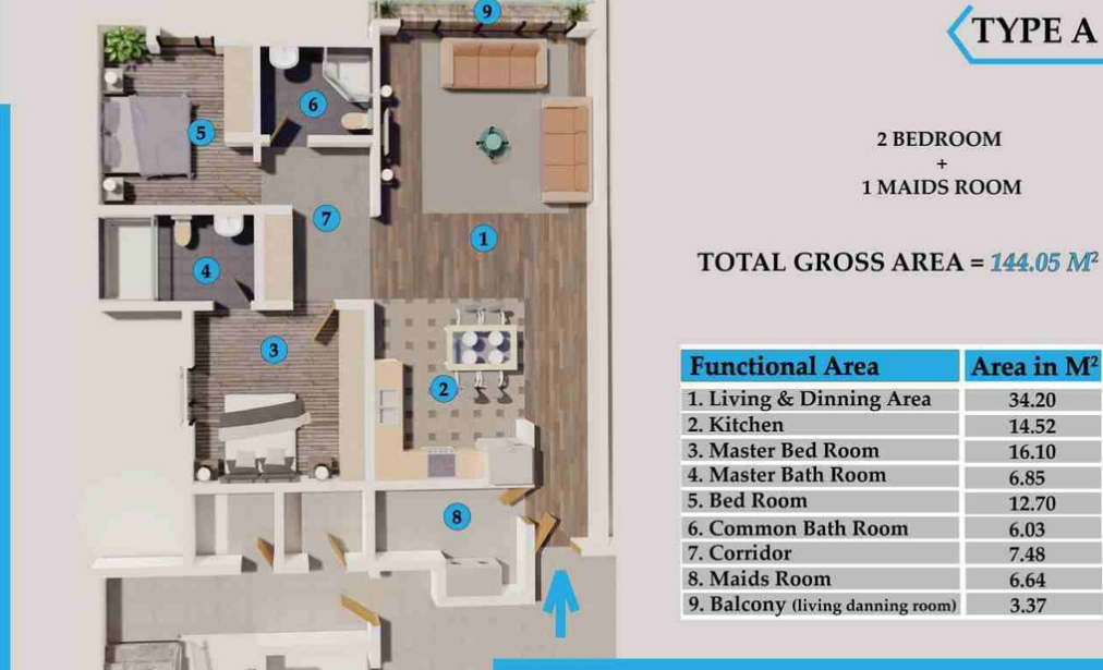 Type A - These apartments typically features a living and dinning room, kitchen, master bed room with it's own master bath room, children room, common bath room, corridor, maids room and balcony { Living and Dinning room}. The total gross area of the unit is 144.05sqm.