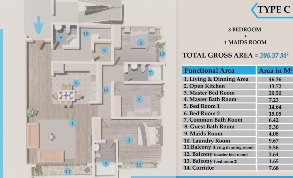 Type C - These apartments typically features a living and dinning room, open kitchen, master bed room with it's own master bath room, two children rooms , common bath room, guest bath room, laundry room, corridor, maids room and three balcony . The total gross area of the unit is 206.37sqm.