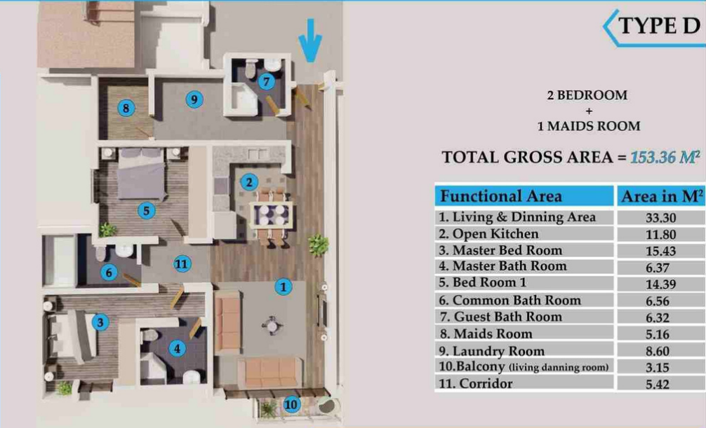 Type D - These apartments typically features a living and dinning room, open kitchen, master bed room with it's own master bath room, children room, common bath room, corridor, laundry, guest bath room, maids room and balcony { Living and Dinning room}. The total gross area of the unit is 153.36sqm.