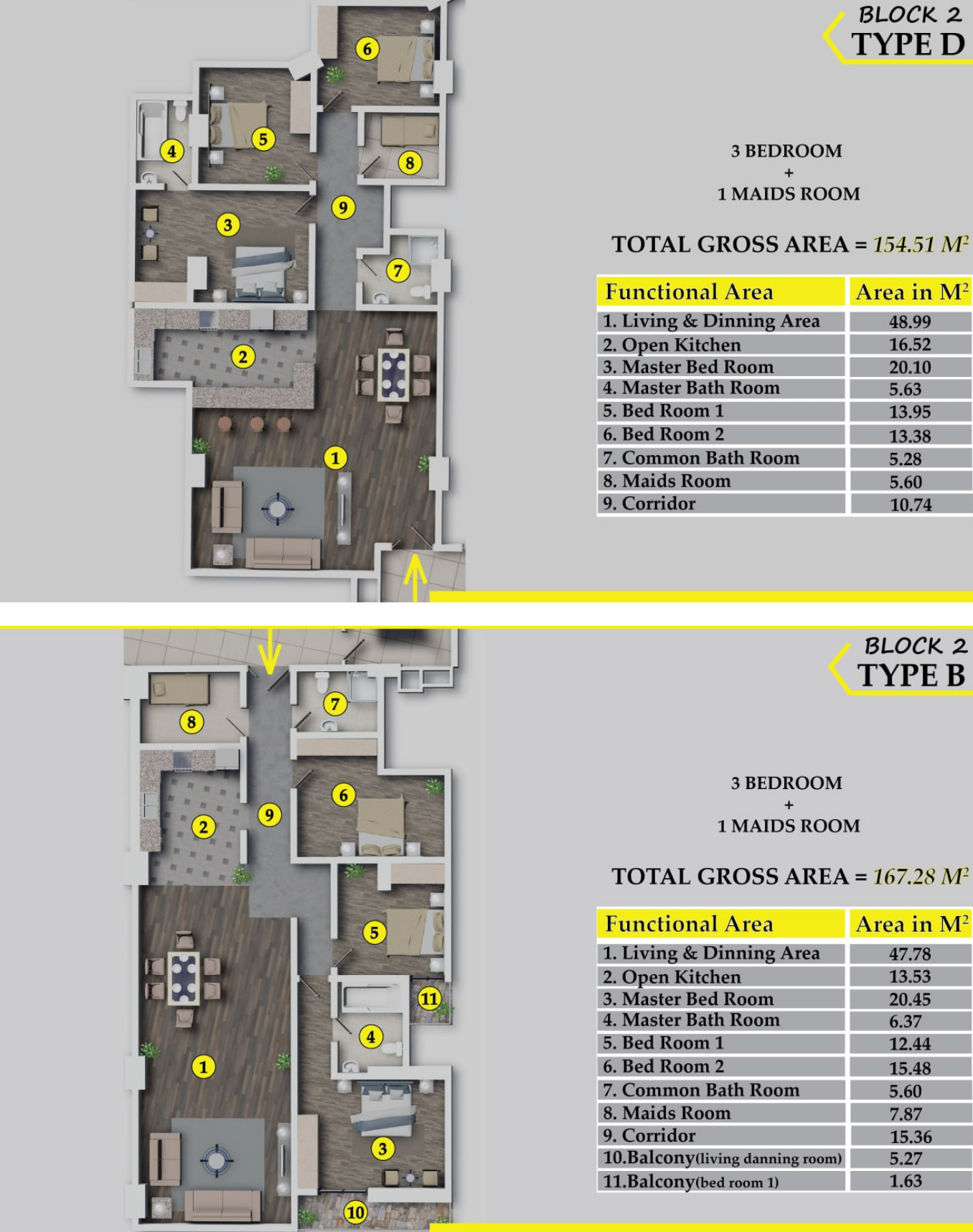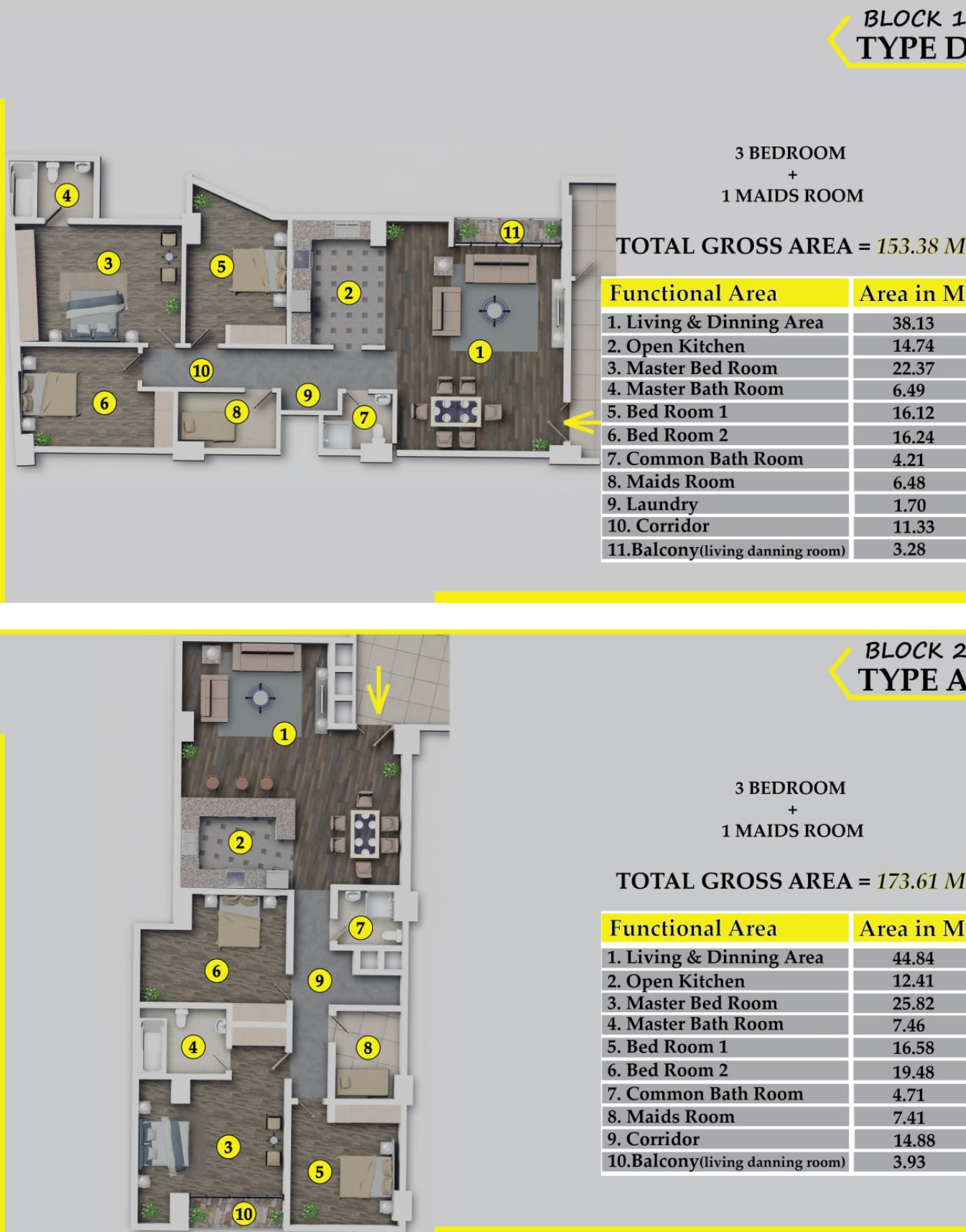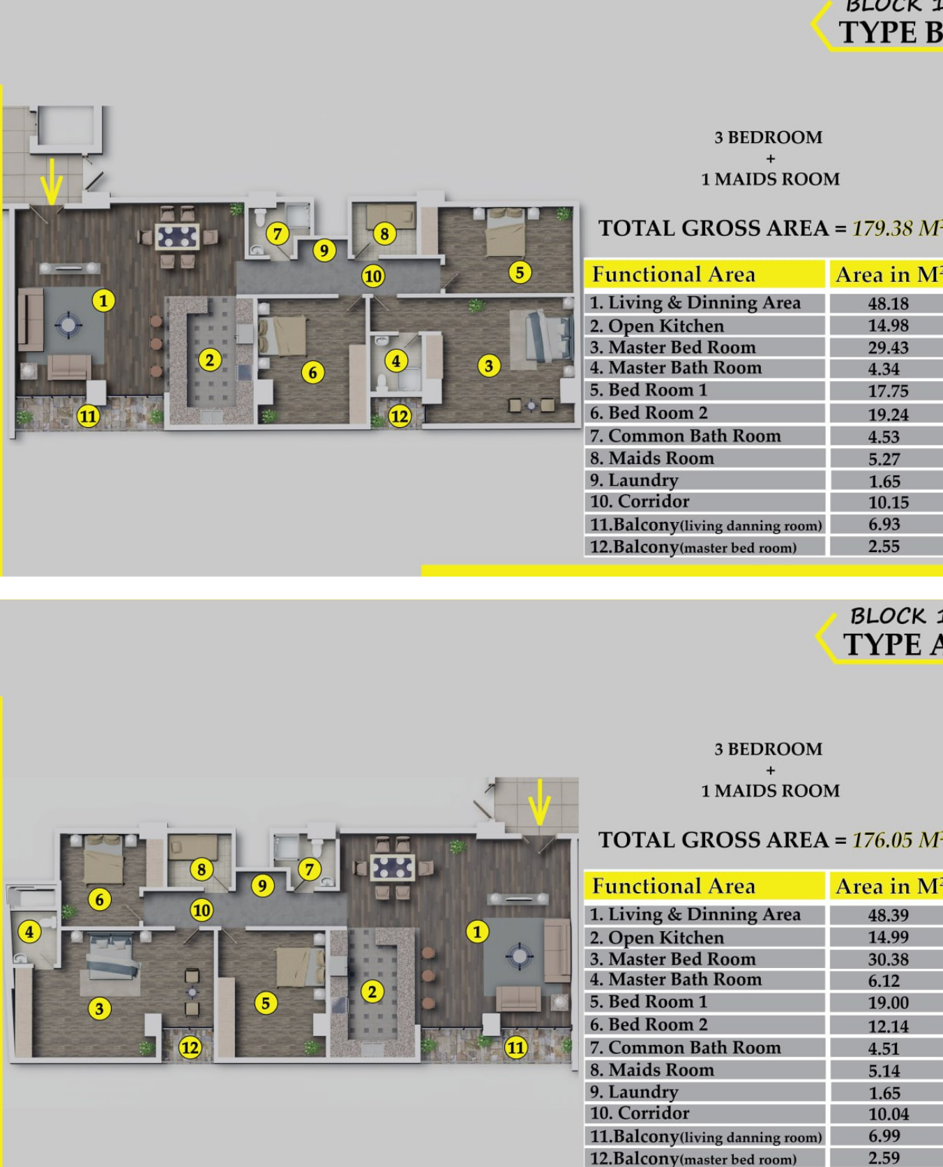 - Two Blocks with Different Sizes: Select from two blocks, each offering a range of spacious layouts to suit your preferences: Block 1: Discover Type A (176sqm), Type B (179sqm), Type C (161sqm), and Type D (153sqm) apartments. Block 2: Explore Type A (173sqm), Type B (167sqm), Type C1 (161sqm), and Type D (154sqm) apartments.